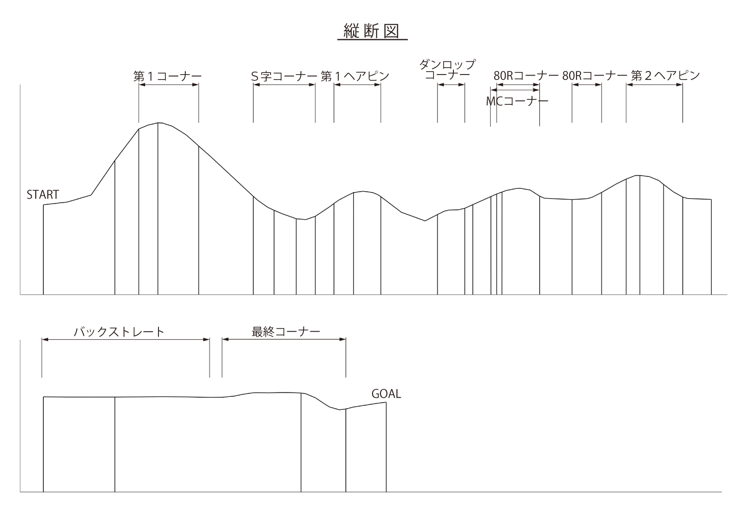 ホームストレートは282mと短いため、最終コーナー立ち上りから第1コーナー進入のブレーキングまで気を抜くことができない。比較的フラットな筑波にあって、ストレートエンドは最も高低差がある上り勾配。