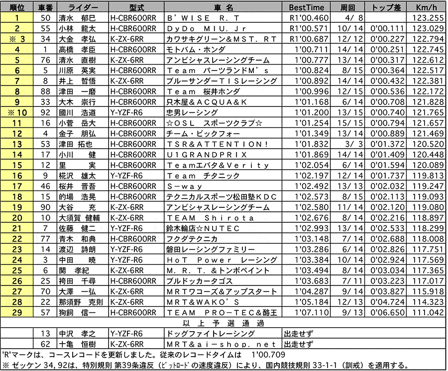 ●チャレンジST600(公式予選結果表・正式決勝結果表)|