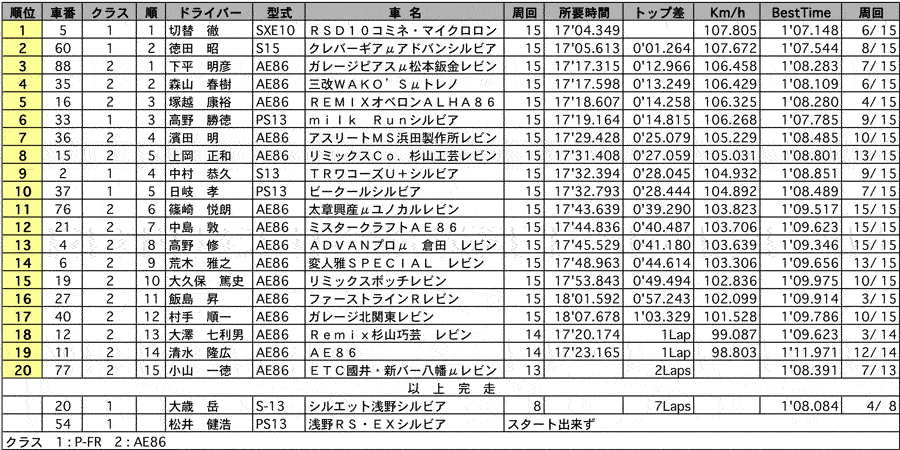 | P-FR&AE86 正式決勝結果表 Weather :晴 Track :ドライ[▲TOP] |