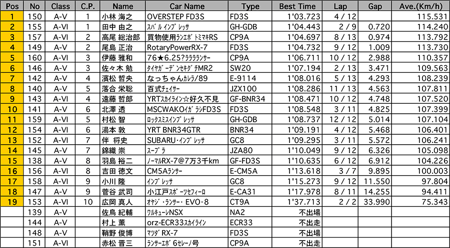 ●ラップタイムアタック第2戦 タイムアタックA組(1stトライ・2stトライ・総合結果)|
