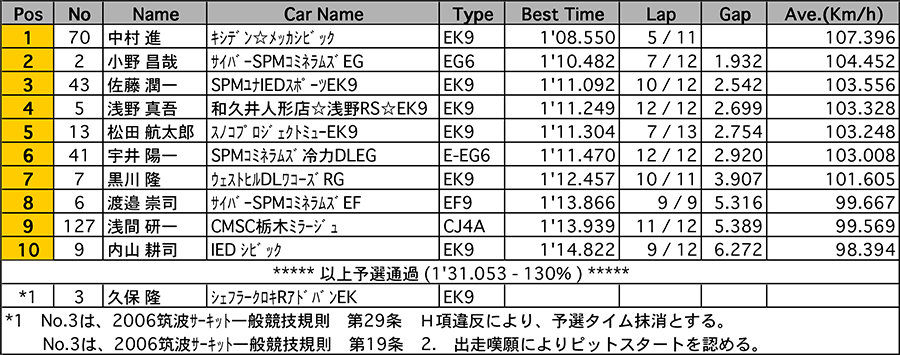 | 2006JRSCCサーキットトライアル選手権シリーズ ラップタイムアタック第2戦 タイムアタックB組(1stトライ) Weather :曇り Track :ドライ[▲TOP] |
