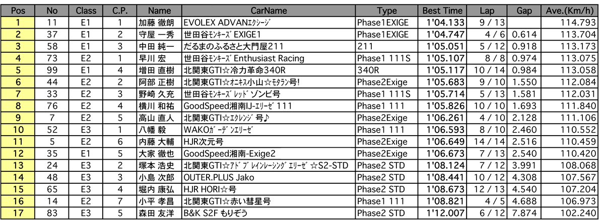 | 111CUP フリー走行(1回目結果) Weather :晴れ Track :ドライ[▲TOP] |