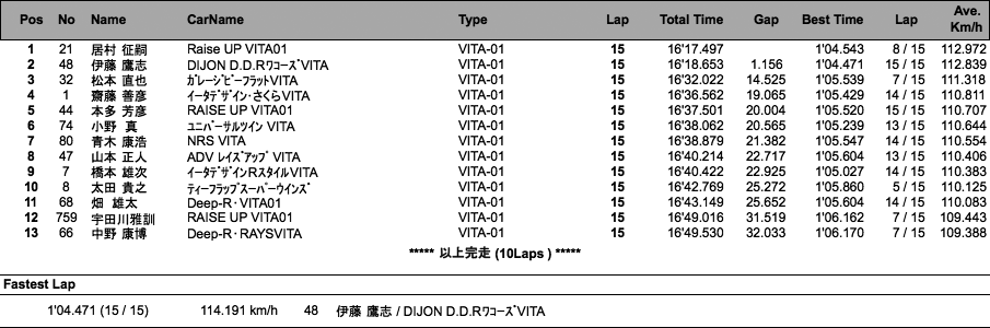 | VITA TROPHY RACE(決勝) Weather :晴れ Track :ドライ[▲TOP] |