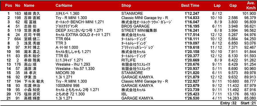 MINI 一般スポーツ走行 FRESHMAN CLASS(総合) Weather :晴れ Track :ドライ[▲TOP]