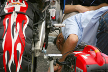 ![]() 車検担当のオフィシャルスタッフさんがマシン下部を確認中。腰を痛めないでくださいね |