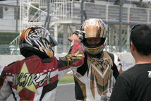 ![]() レース前に互いの健闘を誓ってグータッチ。ヘルメット越しの目は真剣。「勝つのはオレだ!」 |