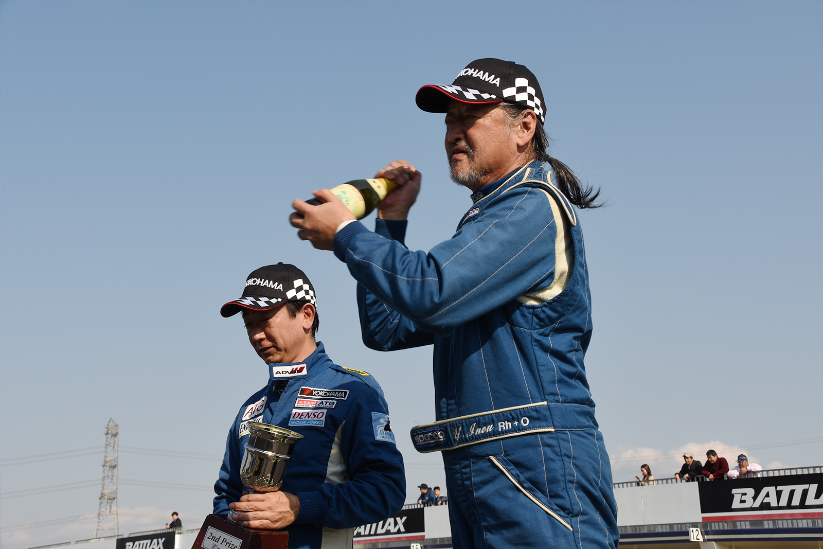 シャンパンファイトですが、マスターズクラスでは表彰台の真ん中に立った1名のみとなります。稲生選手、シャンパン振りすぎです。 |