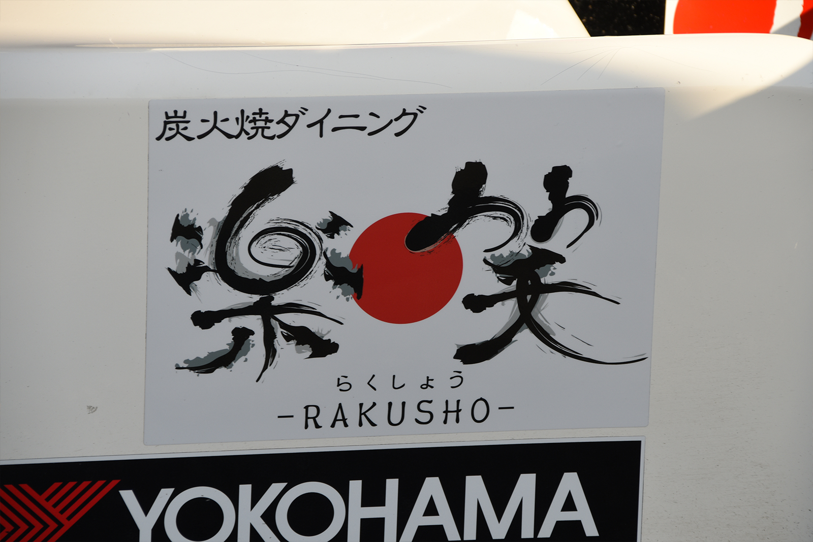 大竹選手のスポンサーには楽笑というお店のステッカーが新たに付きました。「らくしょう」だけに 「最終戦は楽勝でした?」と質問はしませんでしたが… |
