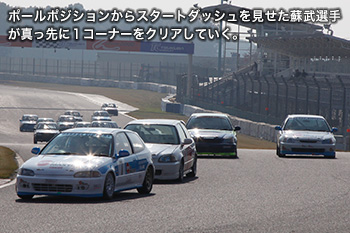 予選で1秒以上の差をつけていた蘇武選手は、スタートからレースをリードし、アグレッシブな走りですぐさま独走態勢を築く。後方では、福田選手が石郷岡健選手を抑えながら周回し、ジリジリと、その差を開いていく。レース終盤になっても蘇武選手の勢いは衰えず、そのままチェッカー。開幕戦以来、今季2勝目を飾った。福田選手は、2位に入り念願のチャンピオンを獲得した。3位に石郷岡選手、4位に内田恒雄選手と続いた。