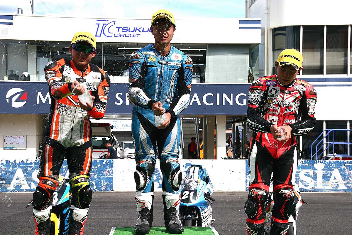 Champagne Fight Report MENU 決勝レポート シャンパンファイト レースアルバム スターティンググリッド 04/15第1戦 07/15第2戦 09/02第3戦 10/07第4戦 オフィシャルスタッフ レースレポート一覧 筑波ロードレース選手権TOP 2023筑波ロードレース選手権 第3戦 シャンパンファイトとポディウム。それはレースで好成績を収めた者のみが許される栄えある特別な場所。シャンパンファイトで弾け、表彰台で誇らしげにするレーシングライダーたちの堂々たる雄姿を紹介します。 TC400 1梶山采千夏 2佐藤道夫 3浅野毅 TC250 1山内健太 2小川亨 3松田明満 S80 1大木俊二 2山崎敏夫 3小池亜久里 4秋山龍生 5濱田樹来 6石倉翔 CBR250RR Dream CUP 1大橋淳希 JP250(I) 1比企徹 JP250(N) 1竹之内力也 2田島涼介 3加藤愛基 JP250 ホンダ賞田島涼介 KTM賞竹之内力也 ST1000(N) 1林勝巳 TC-Formula 1山中正之 2松田光市 3笹原隆男 4山崎張起 5片野陽介 6栗原貞夫 J-GP3(Nat)/NSF250R challenge 1德田翔 2保坂洋佑 3針尾大治郎 ST600(N) 1岡村建 2松本康雅 3芳根大輝 4福地直紀 5松岡久司 6細井祐輔 CBR250R Dream CUP Expert 1高橋孝浩 2本間国光 3宮島正人 4竹中祐季 5遠藤慈生 6片口神月