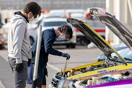 注目の集まった丸山選手は3周目でベストタイムを記録。リアタイヤを交換してさらなるタイムアップを狙いに行くも、この交換が裏目に出てしまう。「ブレーキで足を滑らせてから自分のリズムを崩してしまい、とても難しい予選となってしまいました」と語る丸山選手。ヘアピンでもブレーキをロックさせてしまい思うようにマシンの向きを変えられない。一方、この高気温の中で飛躍してみせたのは車工房リキのませき選手だった。4周目にベストタイムを記録。「朝の路面の状況が分からなかったので、半周遅れて出て行って様子を見たのも良かったです」とはませき選手。早くできあがった路面に合わせこんでのタイムメイクだった。その結果、ませき選手がポールポジションを獲得。2番手には東源夏樹選手が入った。