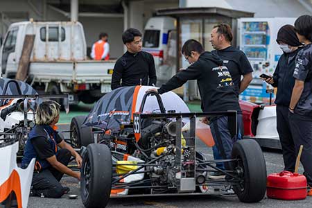 コースオープンと同時に先頭でコースへと飛び出したのは第2戦を制した津田充輝選手と切替悠喜選手の2台。筑波シリーズ規定10に従い決められた順でのコースイン。酒井選手は後方からの最後尾からスペースを作りながらの予選となった。前日からの雨が残るコース。VITA走行後とはいえ、序盤はどうしてもダンプコンディションであることは否めない。そんな中、順調にラップタイムを刻む津田選手。一方、酒井選手のマシンは加速が鈍り苦戦を強いられる。いよいよ終盤のアタックで酒井選手が15周目に58秒8を記録。好タイムを記録するが、17周目に切替選手が58秒717、そして19周目に津田選手が58秒607を記録しポールポジションを獲得した。
