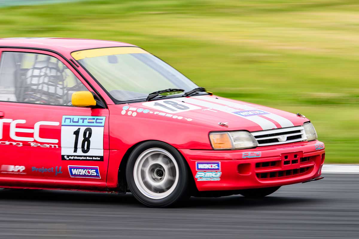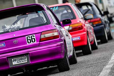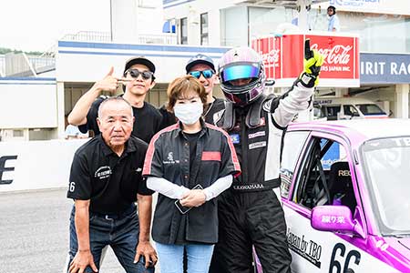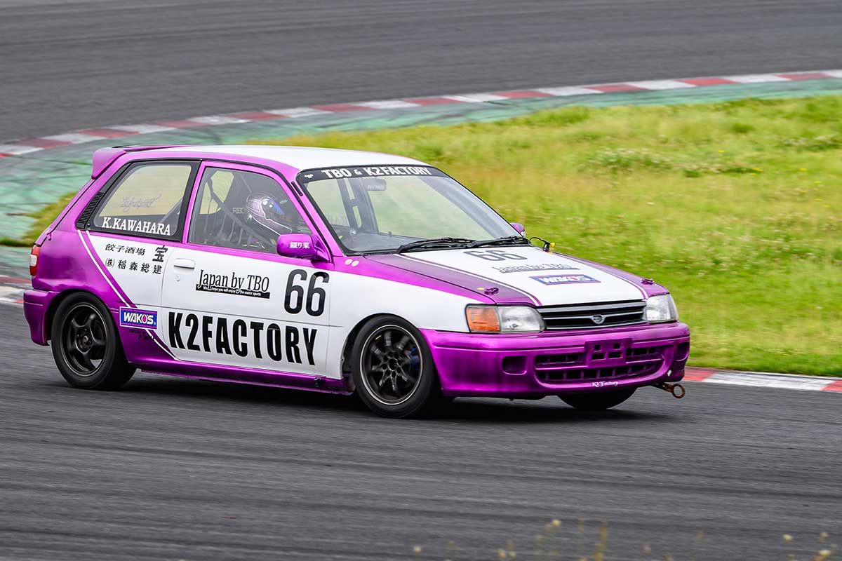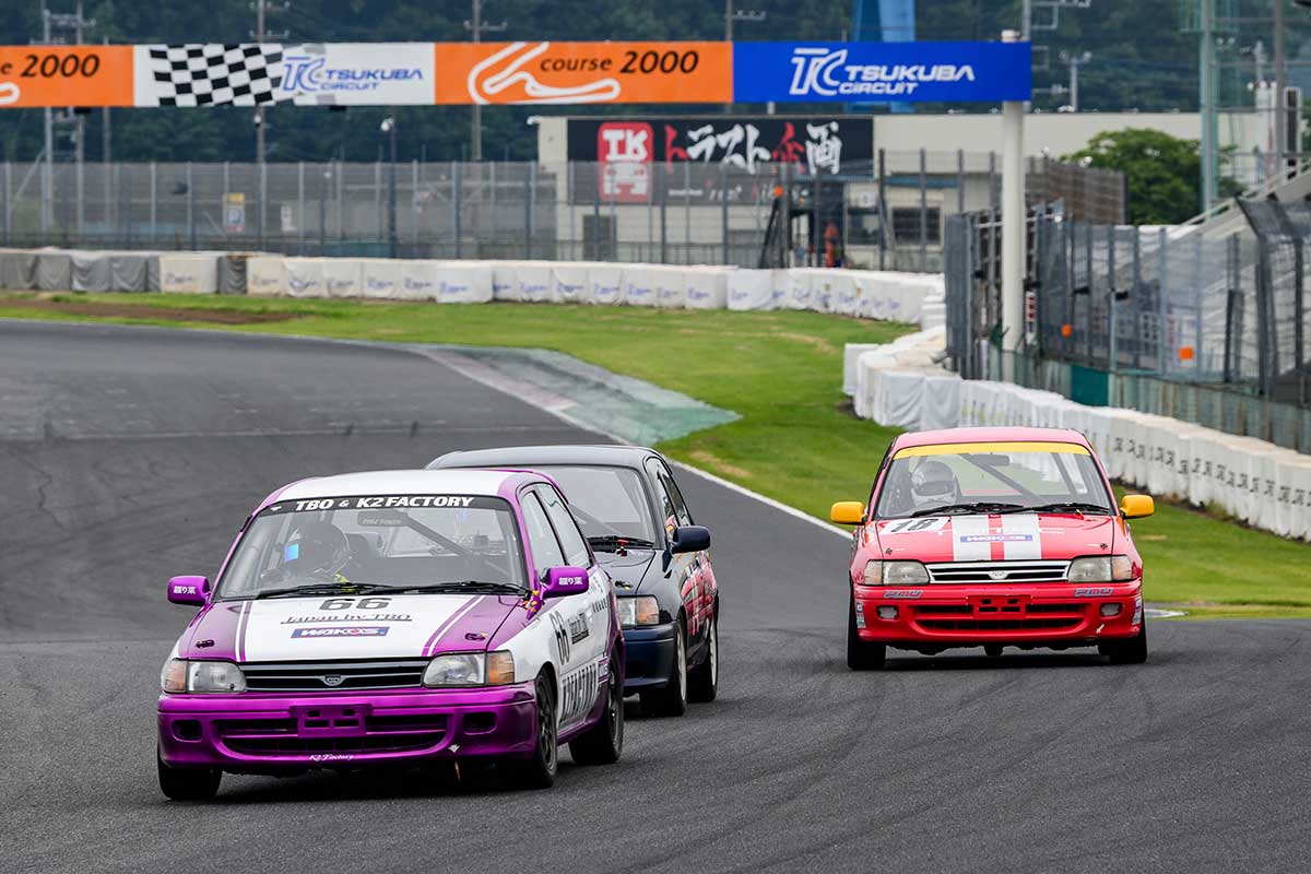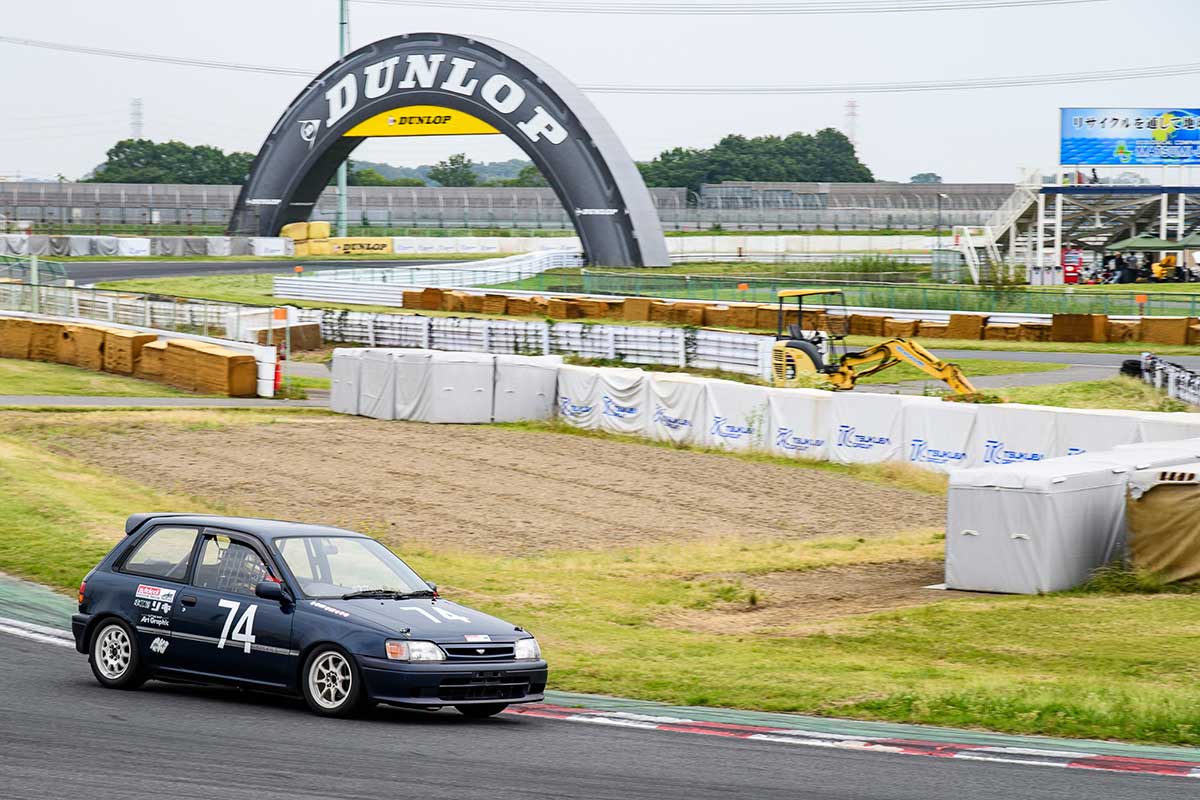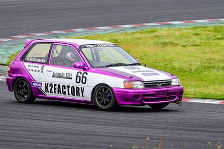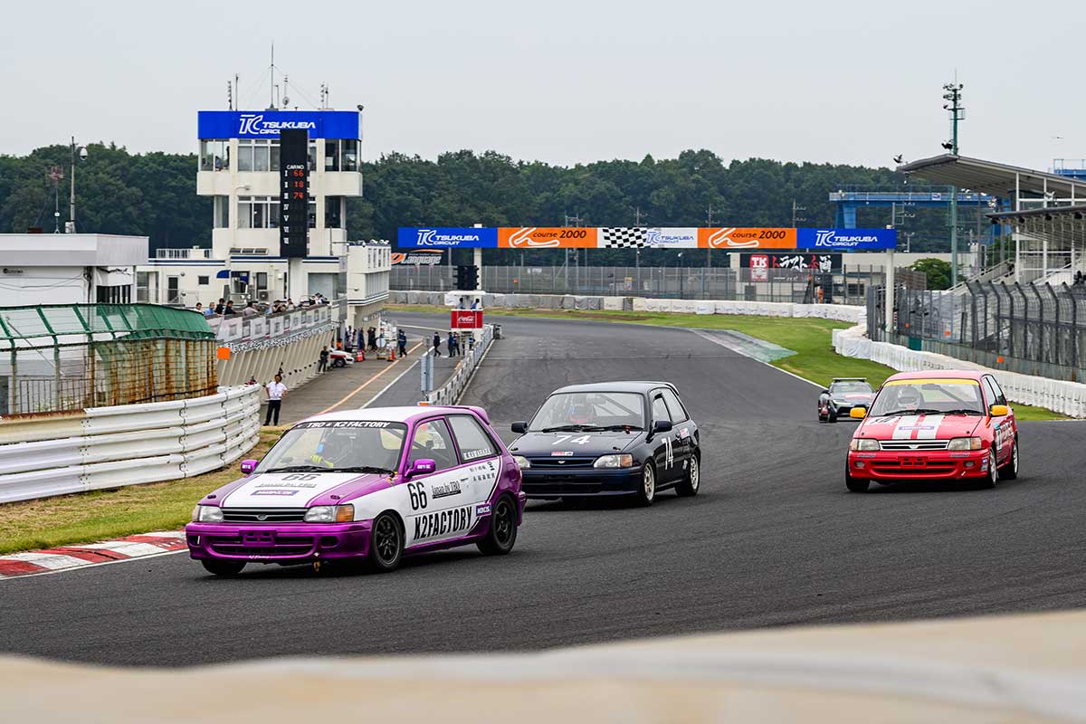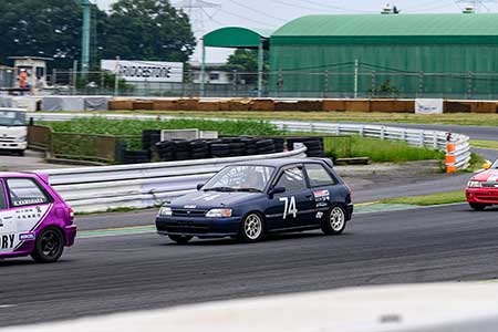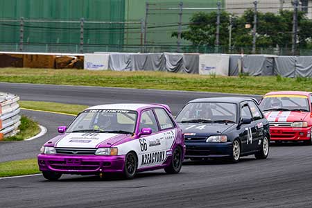 例年、他クラスとの過密な混走を強いられてきたTTC1400。だが今回は、トヨタEP82スターレット3台のみで贅沢に全コースを独占。しかも初戦2位の丸山選手が不在とあって、表彰台の頂点と好タイムが狙える絶好の機会が全ドライバーに到来した。しかし、勝利の女神は簡単に微笑んでくれない。予選では、3月の初戦トップで優勝候補の筆頭だったませき選手に、ブレーキに致命的なアクシデントが勃発。予選最多の11周を走行したが、タイムが一向に伸びず、痛恨の3番手フィニッシュとなった。そして実質上、一騎打ちとなった予選を制したのは、4周目にベストを叩き出した河原選手。念願のポールポジションを獲得し、初優勝への千載一遇のチャンスを掴んだ。