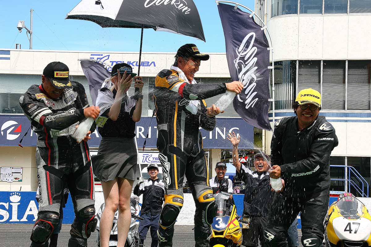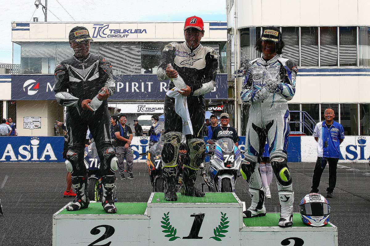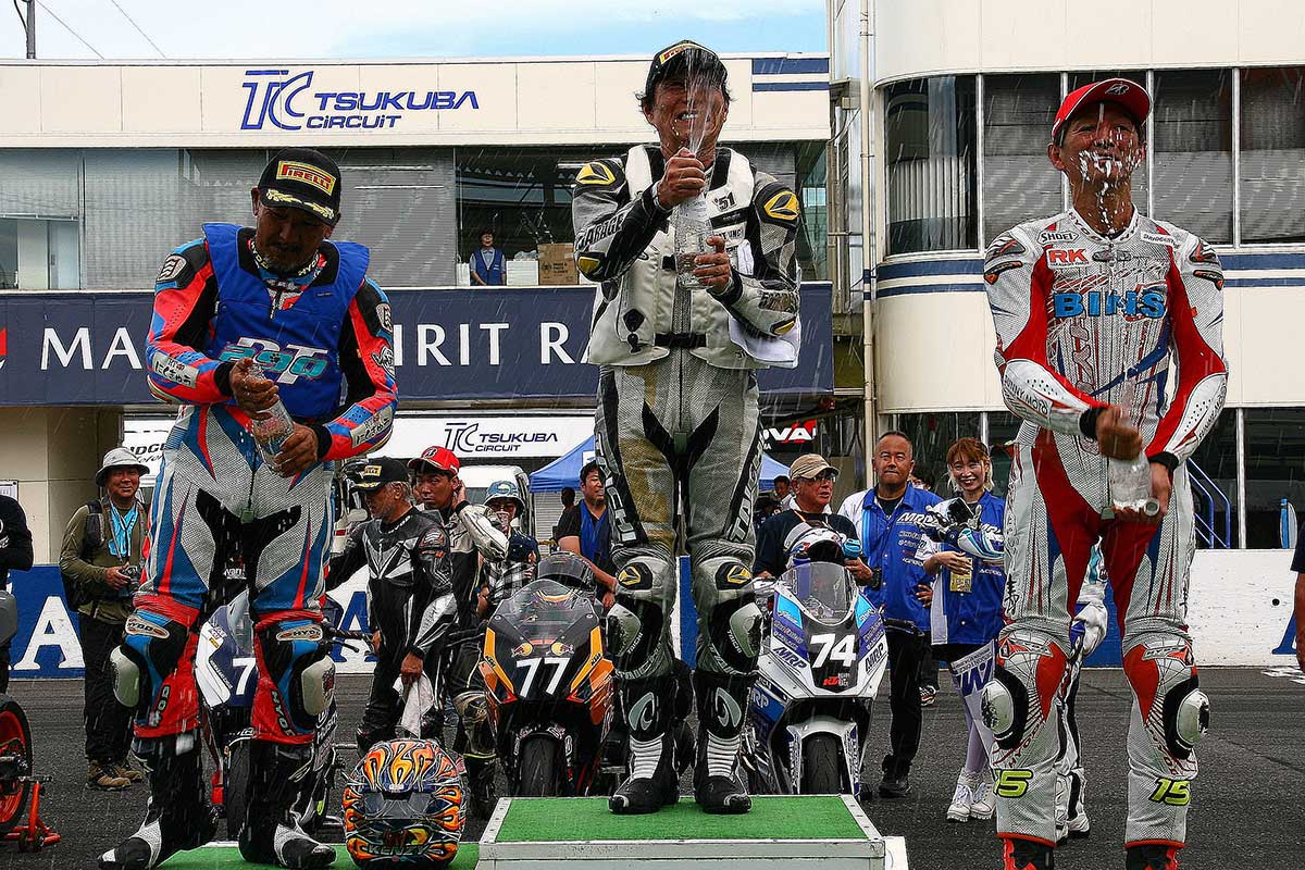 Champagne Fight Report MENU 決勝レポート シャンパンファイト レースアルバム スターティンググリッド 筑波TT'sスマイル 04/05 in APRIL 07/19 in JULY 11/15 in NOVEMBER オフィシャルスタッフ レースレポート一覧 筑波ツーリスト・トロフィーTOP 2025 筑波ツーリスト・トロフィー in JULY シャンパンファイトとポディウム。それはレースで好成績を収めた者のみが許される栄えある特別な場所。シャンパンファイトで弾け、表彰台で誇らしげにするレーシングライダーたちの堂々たる雄姿を紹介します。 NS2 1石戸谷稔 2伊藤祐太 3野村勝 4佐藤立樹 5小島秀明 6宮腰良彦 NM 1藤代義正 2保坂健 3浅野啓治 Battle Of The Twins(ACT) 1波田桂治郎 2西田敏郎 3冨岡春彦 N250F 1近藤秀明 NT2 1橋本卓哉 2尾張良介 3玉利幸治 4小澤光二郎 5小室直久 6佐藤聖 MT1 1田中建 NB 1山本裕章 2日吉健夫 3堀雄大 Frontier2 1楠隼人 2大森竜馬 3小堀誠 4岡﨑雅之 5安藤志朗 6大間雄飛 KTM 390 CUP 390ノーマルファン 1臼倉善則 2長岡健司 3斉藤知宏 KTM 390 CUP 390カスタムチャレンジ 1長尾秀隆 2吉井俊忠 3三田晋 KTM390CUPカスタムエキスパート 1植村哲也 2武田誠浩 3磯雅幸 MIP 1竹田敏彦 Battle Of The Twins(WCT) 1氏家康典 2西田敏郎 3舛井宗一朗 賞典外山口辰也 賞典外新庄雅浩