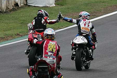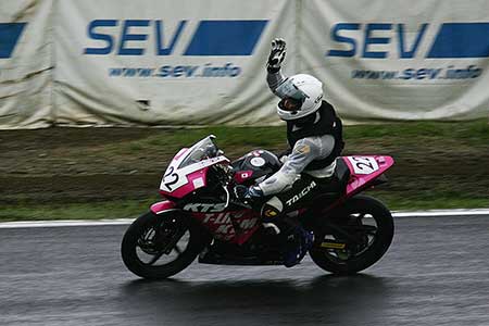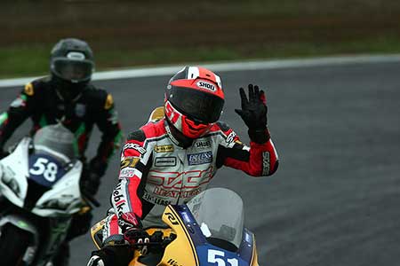 Race Album Report MENU 決勝レポート シャンパンファイト レースアルバム スターティンググリッド 03/08第1戦 06/22第2戦 09/06第3戦 10/04第4戦 オフィシャルスタッフ レースレポート一覧 筑波ロードレース選手権TOP 2025筑波ロードレース選手権 第4戦 最終戦は天気予報が直前で雨へ変わりドタバタ感もありましたがドライでもレインでも、誇らしい好レースだったことは間違いなし。 チャンピオンを決めた歓喜、来シーズンの捲土重来を期す決意。様々な表情が交差した2025年シーズン結びのレースを写真で紹介
