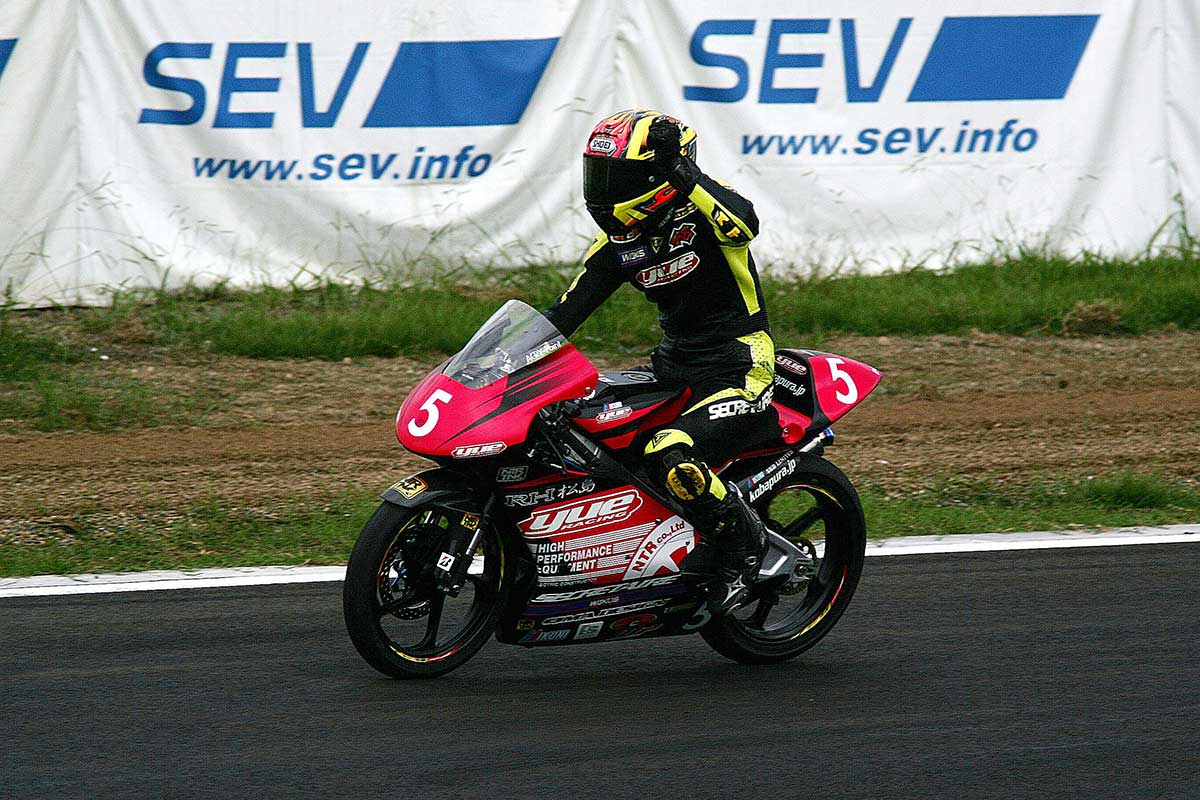 このレース以降は小雨が断続的に続き、ウェットレース宣言が出された。しかし路面はまだ濡れておらず全車がスリックタイヤを装着。No.5市橋貴志がホールショットを決めたが、立ち上がりで膨らみNo.3藤﨑直之がトップに立って1周目を終了した。市橋は持ち直して追撃を開始し、4周目の最終コーナーでトップに浮上。市橋に藤﨑、No.2山崎敏夫、No.10石倉翔、No.15伊藤公一らを加えた先頭集団の中では激しい接近戦が繰り広げられたが、最も優位に立っていたのは最高速を武器とする市橋で、0.069秒差で逃げ切り年間王者を手にした。藤﨑はゴール直前で市橋に並びかけたが届かず2位。以下山崎、石倉、伊藤の順でバトルが決着した。