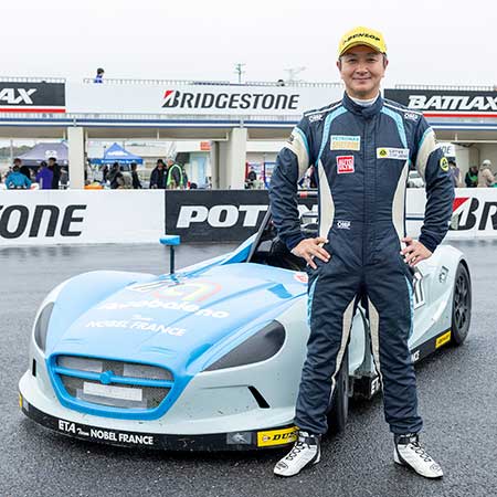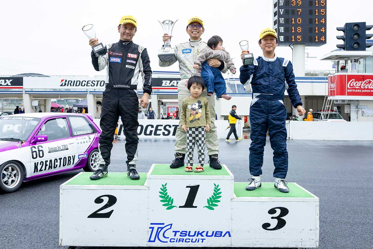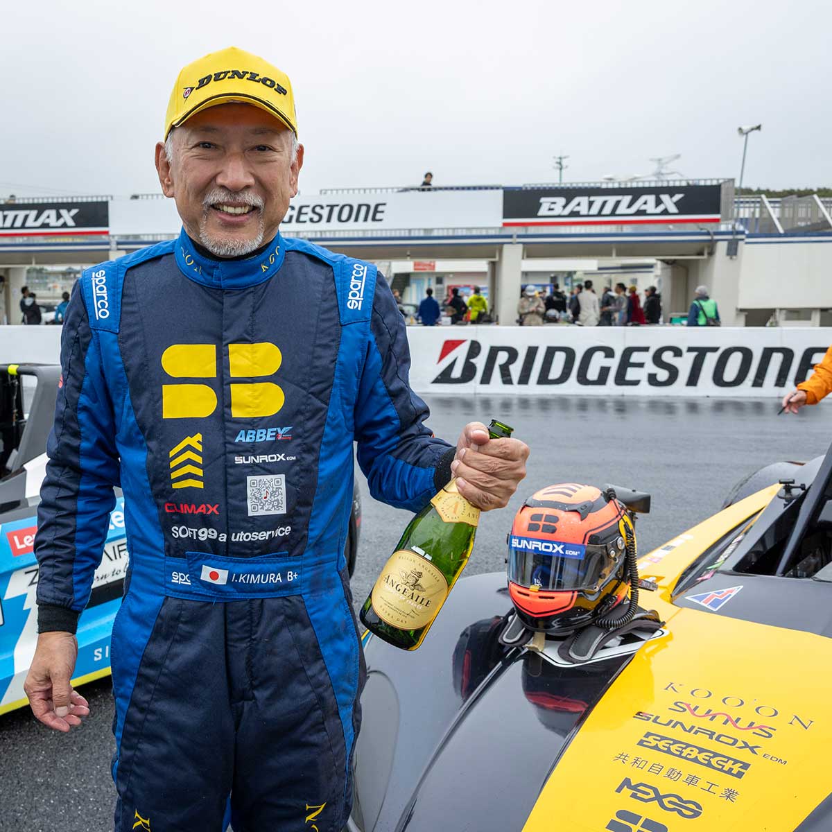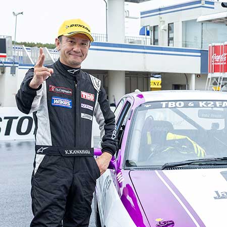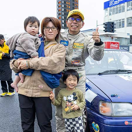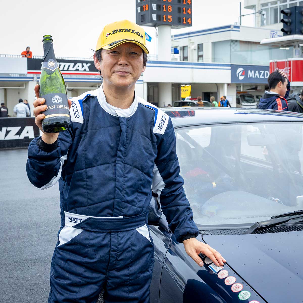今回はプロドライバーの和田選手が参戦するということもあってとても緊張しました。サポート員から『相手はプロなんだから雑に当てるようなミスはしない』という言葉をかけてもらいレースに集中できました。レースがはじまると、こちらとしては雨量が多いことを望んでいたんですが、インターバルでも雨が降り続いてくれたのが味方してくれました。前半はコースに対する習熟度から自分の方がペースはあったのですが、後半になると和田選手に分があったと思います。終盤かなりきついプレッシャーを受けましたが、和田選手のクラッシュで燃費的にも気が楽になりました。毎月、蘇武選手のスライドコントロール練習をしているのが役に立ちました。関根社長に優勝を届けることができて嬉しかったです。これからも社長に喜んでもらえるような下妻市を代表するドライバーに成長していきたいですね