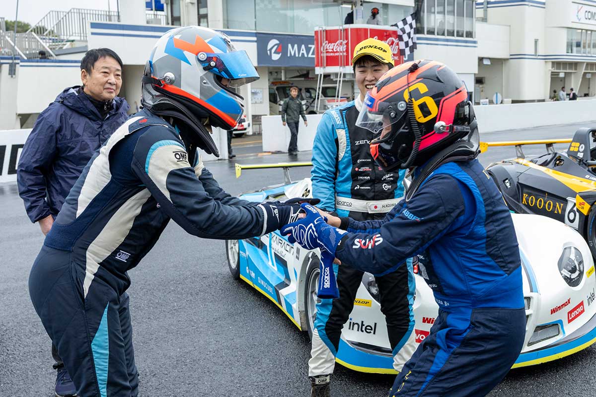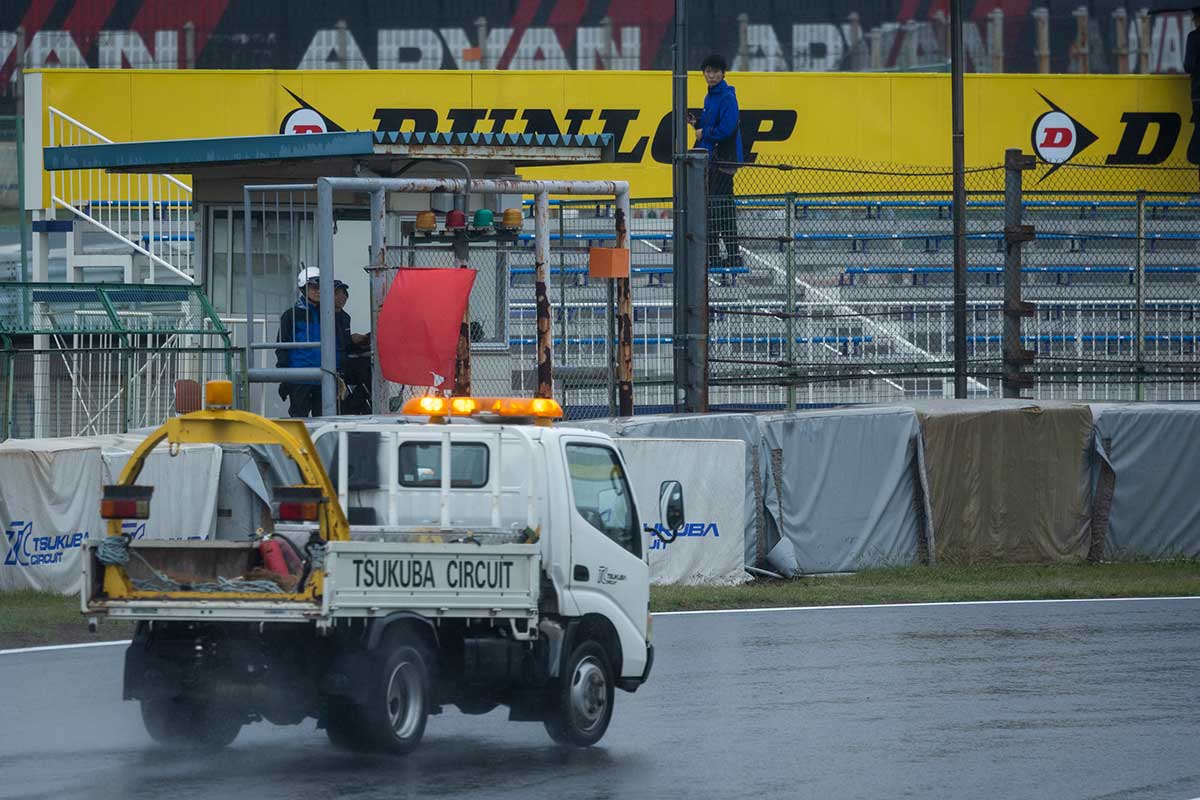 混迷を極めることとなった公式予選。兒島選手から次々とコースインしていく選手たち。インラップで前戦4位入賞を果たした実力者サトウタカヒロ選手が2ヘアでコースアウト。即座に赤旗が提示され誰も計測ラップに入れぬまま公式予選は中断。再開されたのは残り12分。まだ誰も満足なアタックができない中でもきちんとタイムを刻んできたのはやはり兒島選手。計測3周目で15秒443を記録する。西濱選手が同じく15秒台で2番手につけ、ICHIRO KIMURA選手が続いた。しかし、このタイムが記録された直後オイル痕の残る80R先で31号車、71号車が続けてコースアウト。再び赤旗が提示され公式予選は終了。ポールポジションは5戦連続で兒島選手が勝ちとった。