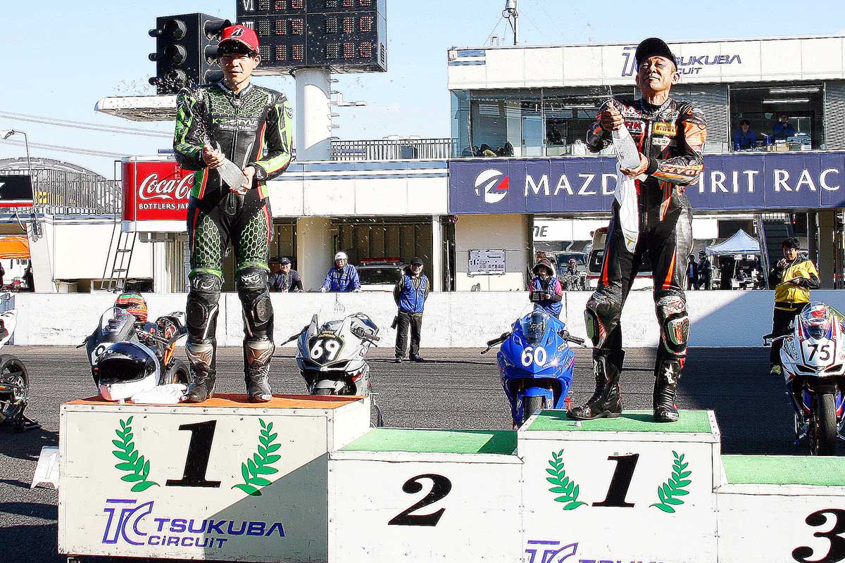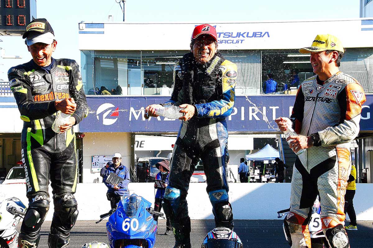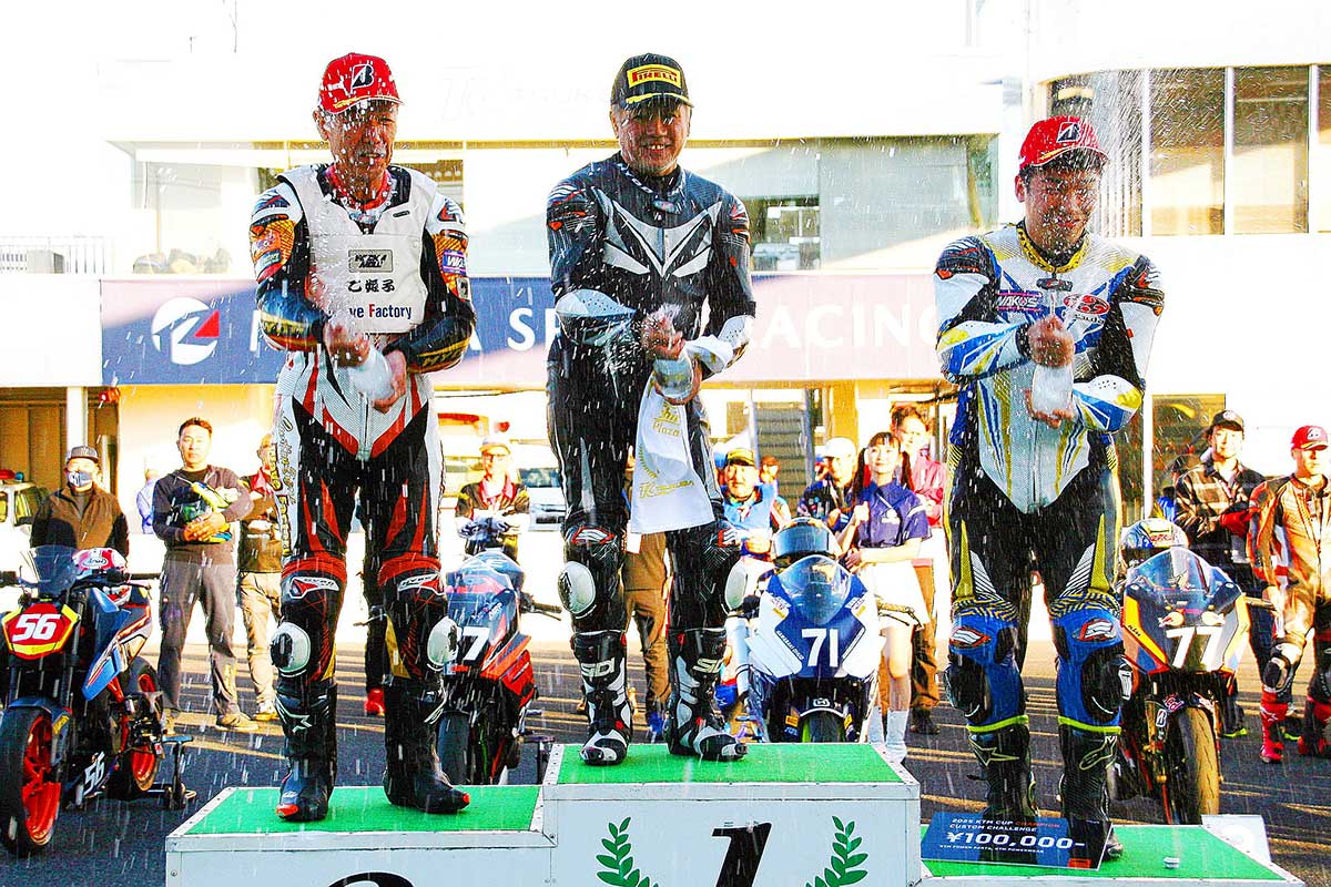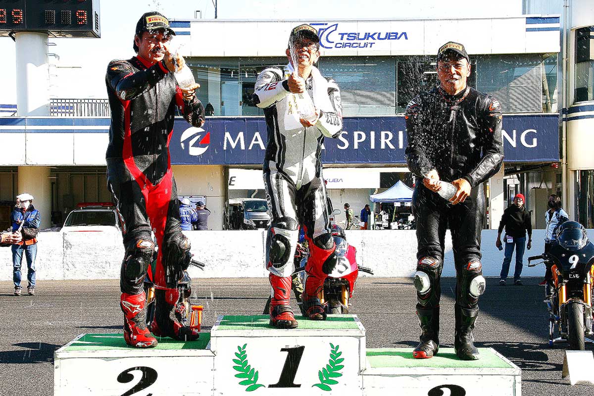 Champagne Fight Report MENU 決勝レポート シャンパンファイト レースアルバム スターティンググリッド 筑波TT'sスマイル 04/05 in APRIL 07/19 in JULY 11/15 in NOVEMBER オフィシャルスタッフ レースレポート一覧 筑波ツーリスト・トロフィーTOP 2025 筑波ツーリスト・トロフィー in NOVEMBER シャンパンファイトとポディウム。それはレースで好成績を収めた者のみが許される栄えある特別な場所。シャンパンファイトで弾け、表彰台で誇らしげにするレーシングライダーたちの堂々たる雄姿を紹介します。 NS2 1石戸谷稔 2薄井徹也 3佐藤立樹 4池田伶人 5栗原文太郎 6野村勝 NM 1保坂健 2水口翔一 3反町瑞希 4富樫崇郎 5吉田龍生 6伊東優樹 MDT 1古瀬文雄 Battle Of The Twins(ACT) 1石塚孝雄 2波田桂治郎 3西田敏郎 N250F/NS1 N250F池永龍哉 NS1植村哲也 NT2 1掛川啓一 2橋本卓哉 3尾張良介 NB 1松浦寛 2笹尾直邦 3林龍斗 Frontier2 1小堀誠 2岡﨑雅之 3安藤志朗 4小宮雄一 5金子聖希 6三木学 KTM390CUPノーマルファン 1臼倉善則 2長岡健司 3斉藤知宏 KTM390CUPカスタムチャレンジ 1吉井俊忠 2中林茂喜 3長尾秀隆 KTM390CUPカスタムエキスパート 1植村哲也 2佐久間咲斗 3小室旭 MIP 1砂塚知男 Battle Of The Twins(WCT) 1西田敏郎 2名越公一 3舛井宗一朗 賞典外新庄雅浩